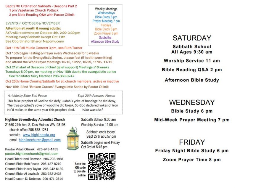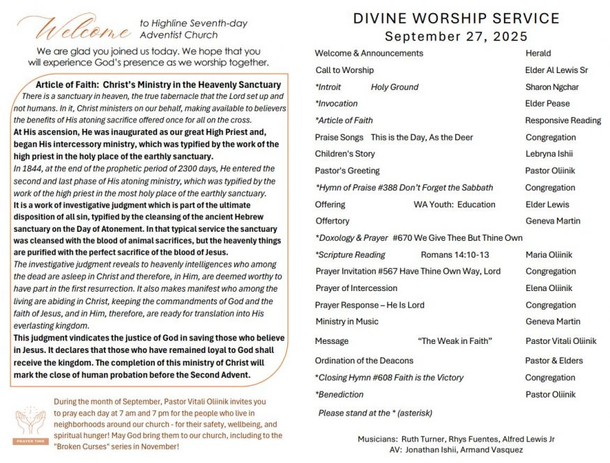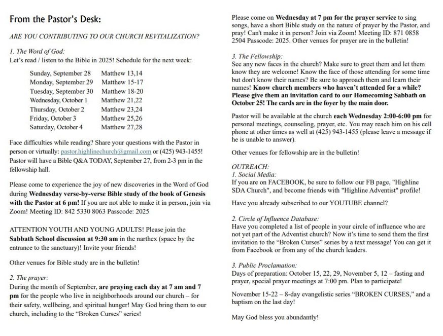 If you are unable to attend in person, please visit the Highline SDA home page on YouTube.